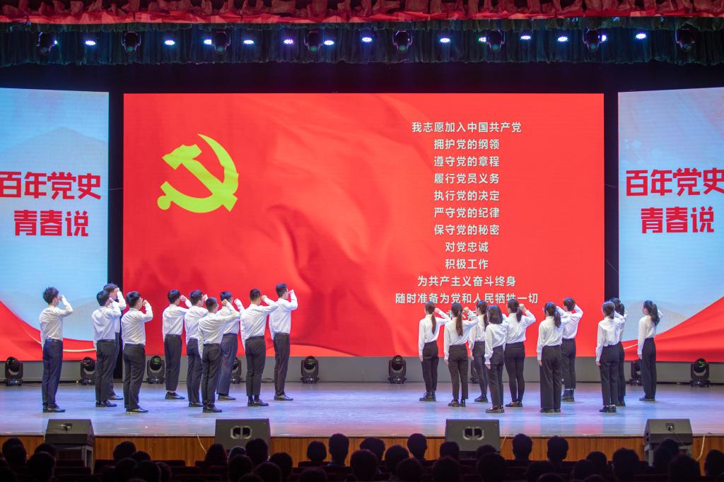 “我志愿加入中国共产党,拥护党的纲领,遵守党的章程,履行党员义务……”江苏海洋大学20名党员代表走上舞台中央,举起右拳,面对鲜红的党旗,重温入党誓词,铿锵有力地誓言在礼堂久久回响。