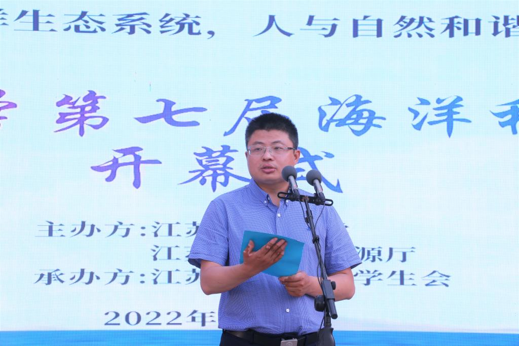 江苏省自然资源厅副厅长李如海通过视频问候全校师生,充分肯定我校发挥学科优势和学校特色,在海洋知识科普、海洋意识培育、海洋装备研发、海洋生物制药等方面的努力和成绩,同时寄语大学生要心怀海洋强国之志、厚植海洋基因,建设海洋强省、海洋强国。