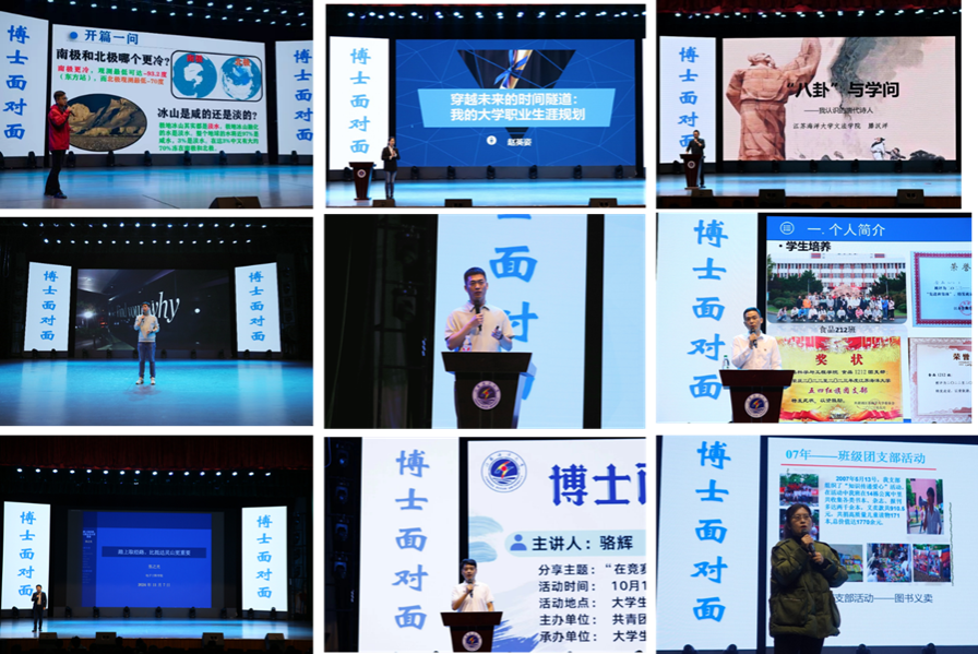 海洋科学与水产学院陈阳军博士结合自己参与第35次南极科考的见闻,介绍了“建设海洋强国”的战略部署下,党领导的极地事业的发展,强调了极地科考的重要性。商学院赵英姿博士分别从个人价值、团队价值和社会价值三个层面分享了自己的大学职业生涯规划,鼓励同学们成为一个有价值的人。文法学院滕汉洋博士以自身深厚的学识为基础,用富有幽默感的表达方式,生动地将真实的唐代诗人呈现给现场同学,强调了传统文化的价值以及文化传承和文化自信的重要性。机械工程学院的王童博士从出国留学途径,学生会与社会服务,大学生涯规划,澳洲生活四个方面进行了分享,为大学生涯规划提出了多个实用建议,勉励同学们珍惜时光,努力提升自己。海洋科学与水产学院的李贺博士介绍了自己参与海洋科考的经历,并以学长的身份为现场同学进行考研经验分享,勉励同学们路在脚下,脚踏实地持续不断的努力才是解决问题的最优解。海洋食品与生物工程学院的王文彬博结合自己的成长经历对“大学应该怎么过?”提出了切实诚恳的建议,并鼓励同学们以梦为马,知行合一,坚持实践,成就梦想。土木与港海工程学院的骆辉博士结合参加教育部高排行榜学科竞赛的经历,鼓励同学们以竞赛为基础,建立“竞赛-大创-科研-国奖”冲刺目标,在科研和竞赛中成长,在磨砺中不断进步。电子工程学院的张之光博士从直面天命、勇敢的踏上“取经路”、确定“自己的灵山”等方面强调了“踏上取经路,比抵达灵山更重要”,并以《西游记》中孙悟空所说的“只要你见性志诚,念念回首处,即是灵山。”勉励现场师生。土木与港海工程学院的张楚旋博士以时间为线索,将自己在大学的18年经历娓娓道来,鼓励现场同学偶尔迷茫时,可以从经典的红歌、红剧当中汲取力量。