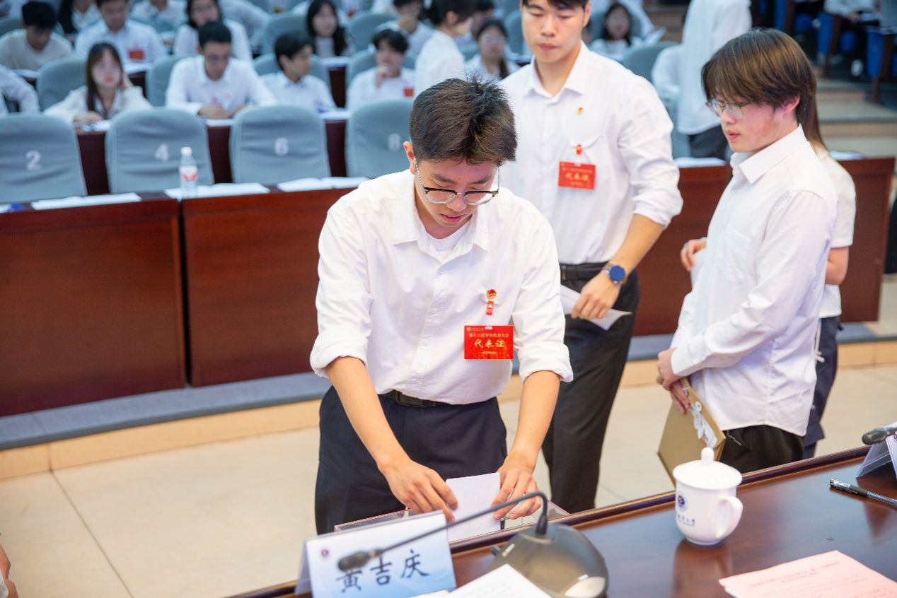 之后,江苏财会职业学院学生会主席团成员王诗惠同学代表兄弟院校致贺信。学代会、研代会分别前往会议中心黄海厅、东海厅召开正式会议。学生会执行主席吕修祥、研究生会执行主席马源分别代表上一届学生会、研究生会向大会作工作报告。全体与会代表投票选举新一届学生会、研究生会主席团成员。