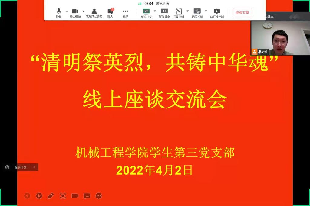与此同时,机械工程学院各学生党支部也组织学生党员广泛开展了“清明祭英烈,共筑中华魂”线上主题党日活动,通过开展在线祭拜、线上交流座谈等方式,弘扬英烈事迹、传承英烈精神,积极营造崇尚英雄、学习英雄、捍卫英雄、关爱英雄的浓厚氛围,同时也让学生党员在活动中思想受到洗礼,灵魂得到荡涤,进一步增强了学生党员的党性修养和爱国情怀。