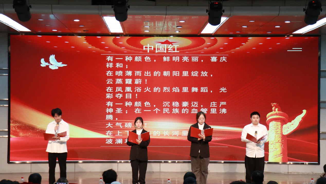比赛中,海环1211班的朗诵节目《融古今精粹,筑中华盛世》拉开帷幕,他们别具一格的以一段戏曲开场,清脆的嗓音,轻盈而有力量,在朗诵过程中他们声音饱满,慷慨激昂,信心满怀,让现场的观众深受感染。生技1211班《中华颂》,朗诵铿锵有力、激情豪迈, “中华是我家,中华是我们的家”表达了对祖国清澈而诚挚的爱。海科1211班的《我脚下的九百六十万平方公里土地》将活动现场氛围推入高潮,他们以歌声切入朗诵主题,富有感染力表现,激起全场观众的强烈的民族自豪感,引发了现场观众的热烈掌声。