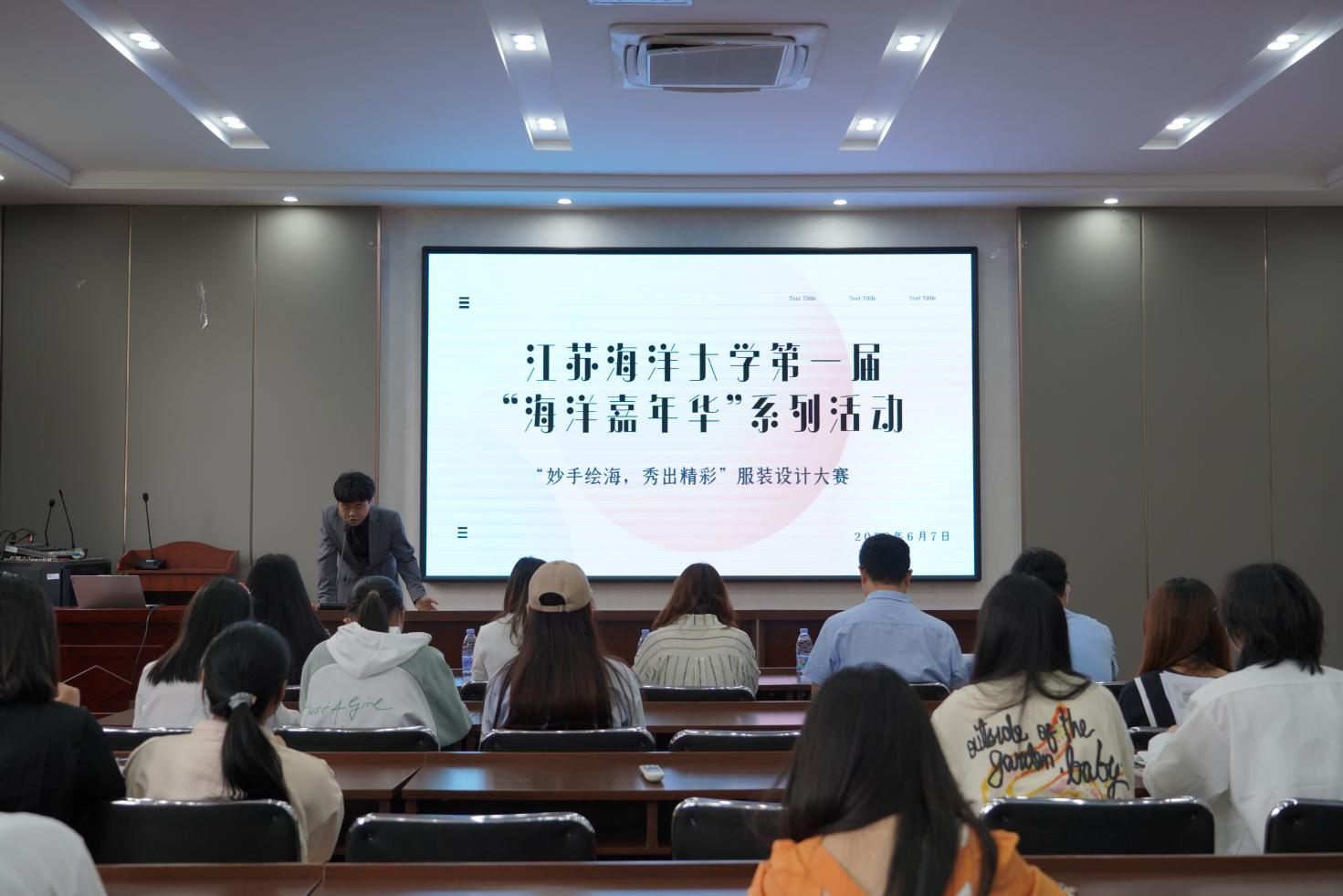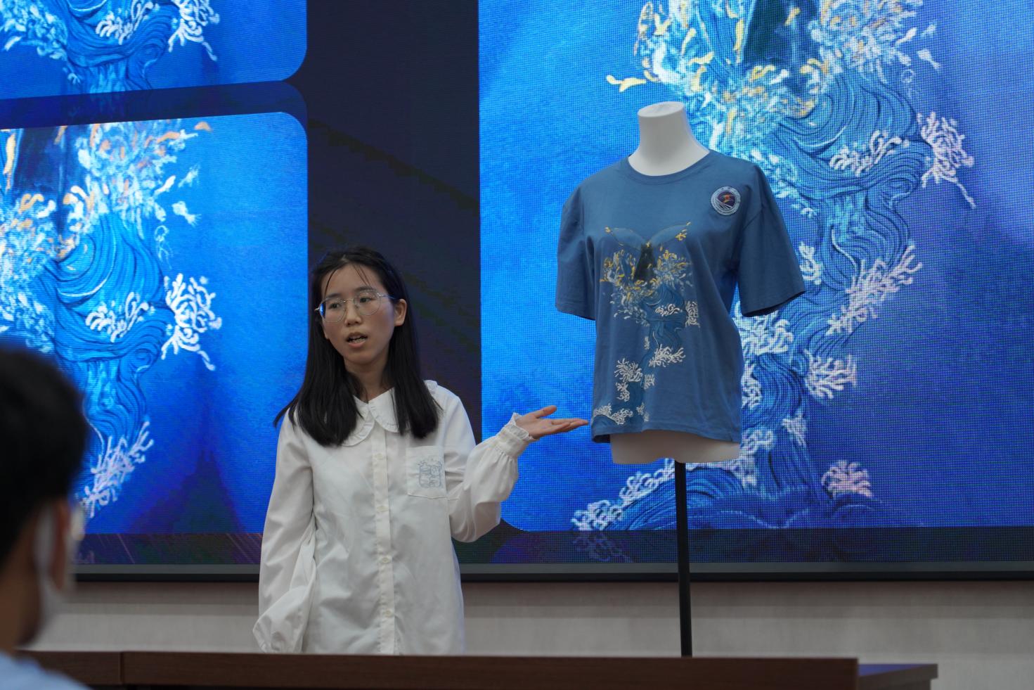 决赛阶段,邀请到了艺术设计学院副教授闵元元老师、海洋科学与水产学院团委书记唐振新老师、土木与港海工程学院团委书记卞辉老师以及两位大学生艺术团学生骨干担任评委。选手们按序展示作品、讲解作品,通过现场的ppt和服装展示,向大家详细生动阐述作品的设计理念和创新性、实用性等方面特点,传达自己对海洋环保的独特见解。