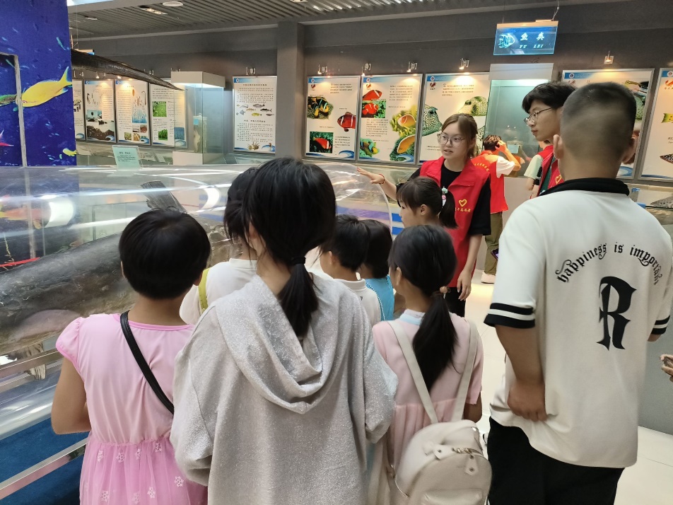 在趣味物理实验馆中,孩子们聚精会神地看着志愿者哥哥姐姐们的操作和演示,随即三五一组尝试了飞机升力、能量穿梭机、混沌摆、万花筒等科学实验,不仅感受到了科学的神奇与魅力,还锻炼了他们的动手能力、逻辑思维能力以及团队合作精神。在海洋馆中,志愿者进行以“保护海洋生态”为主题的讲解,为孩子们介绍了各种关于海洋生物、海洋保护、海洋科学研究等相关海洋科普知识,呼吁大家要时时刻刻保护海洋生态环境。孩子们还认真观察了许多海洋生物标本和金属矿物,如中华鲟、大白鲨、孔雀石等,通过实践和参观,孩子们对科学和自然有了更深入的认识和理解,趣味物理实验和海洋科普在他们幼小的心灵中埋下了科学的种子,相信未来定会在建设海洋强国的征程上开花结果。