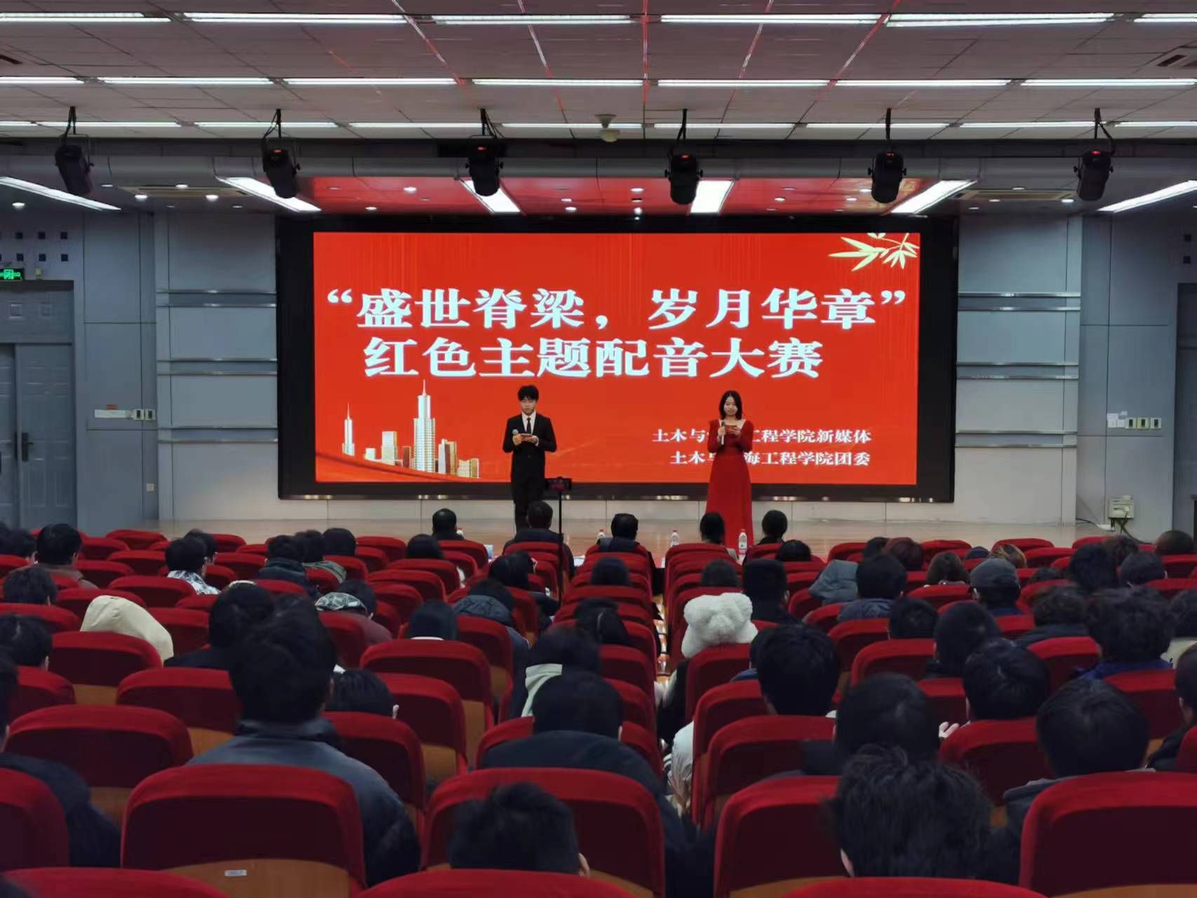 为深入学习贯彻党的二十大精神,培育大学生的社会主义核心价值观,涵育大学生的爱国主义情怀,2023年11月29日晚,土木与港海工程学院于艺术报告厅举办了“盛世脊梁,岁月华章”红色主题配音大赛。本次大赛由土木与港海工程学院新媒体发展中心和团委主办,邀请了校党委宣传部副部长陈晓艳、土木与港海工程学院党委副书记魏学庆、校党委办公室秘书科科长包家官、校团委组宣部部长周小晓、土木与港海工程学院团委书记卞辉担任评委,来自各学院的8支队伍进入决赛。