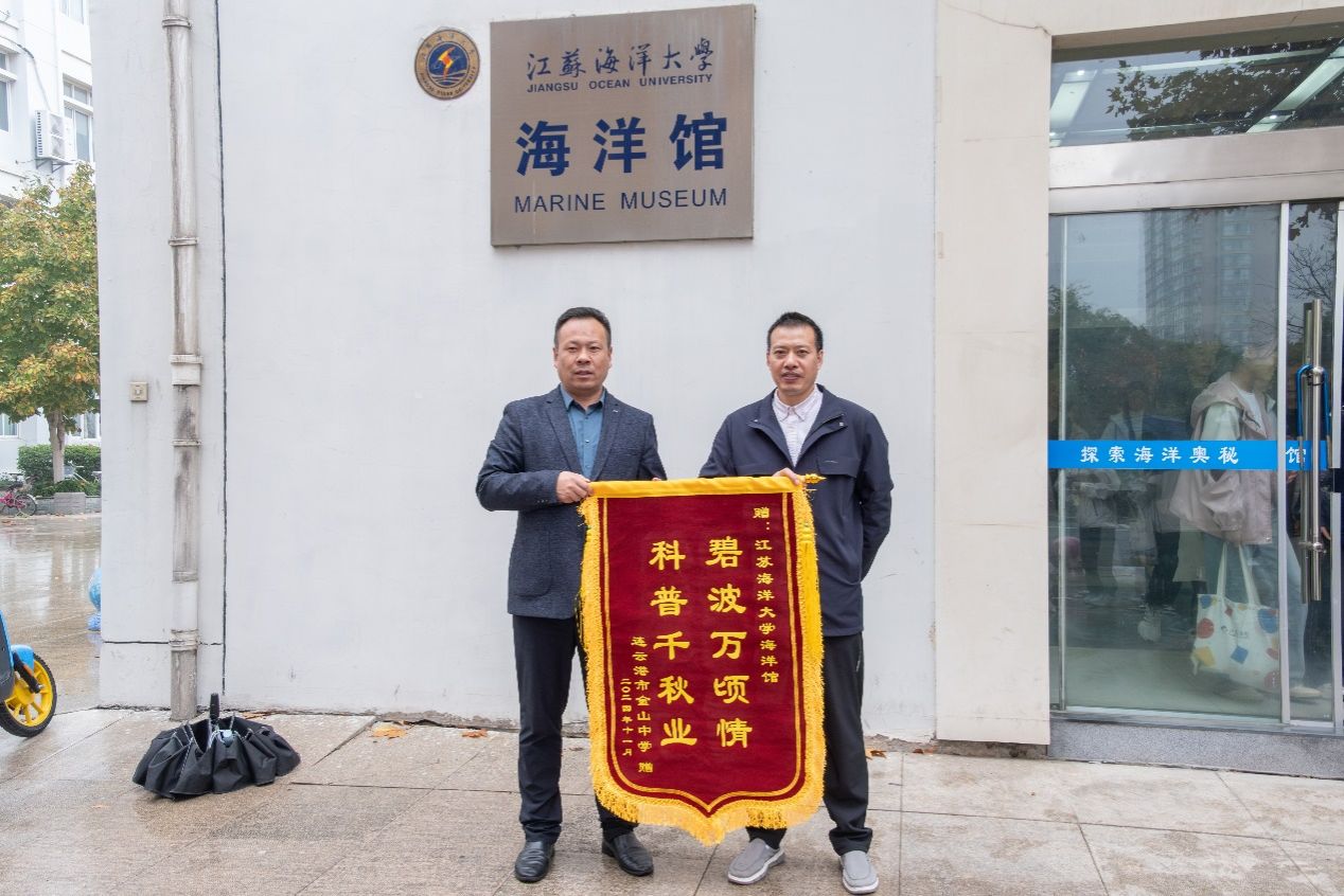 连云港市金山中学将写有“碧波万顷情,科普千秋业”锦旗进行赠送,表达对我校海洋科普工作的认可与感谢。