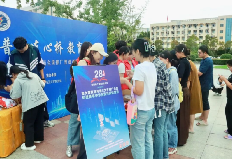 为积极响应并深入贯彻国家语言文字方针政策,切实提升全校师生的语言文字规范意识与应用能力,9月17日下午,江苏海洋大学文法学院于苍梧校区三食堂旁小广场精心策划并成功承办了以“普语连心桥、教育强国路”为主题的第28届全国推广普通话宣传周活动。此次活动覆盖全校学生与教职工,通过匠心独运的环节设计与实用丰厚的奖品激励,激发了广大师生的参与热情,现场氛围热烈非凡,为秋日校园增添了一抹浓郁的“书香雅韵”。