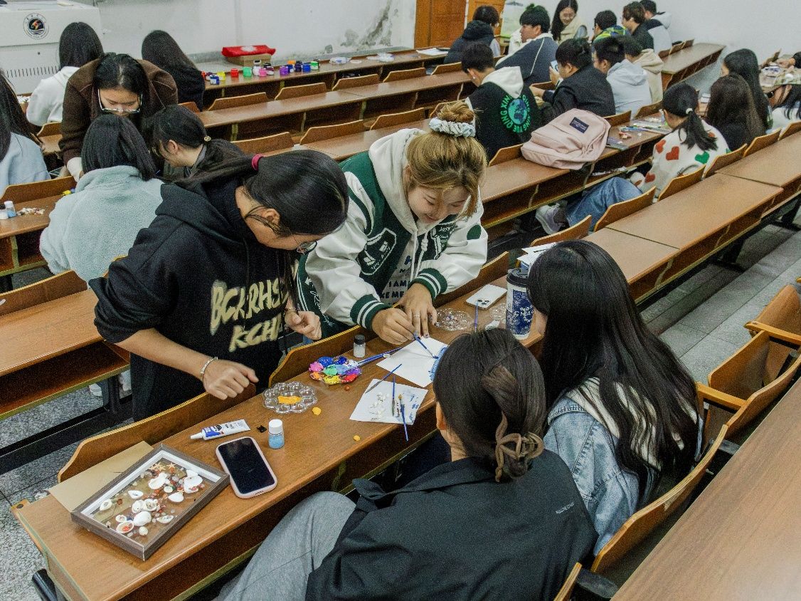 活动开始前,学院学生会权益部成员精心布置了现场,以海洋蓝为主色调营造出沉浸式的创作环境,并提前准备了形态各异的鹅卵石、多种颜色的丙烯颜料及各类画笔工具,确保活动顺利开展。现场气氛热烈,吸引了本院各年级学生踊跃参与。