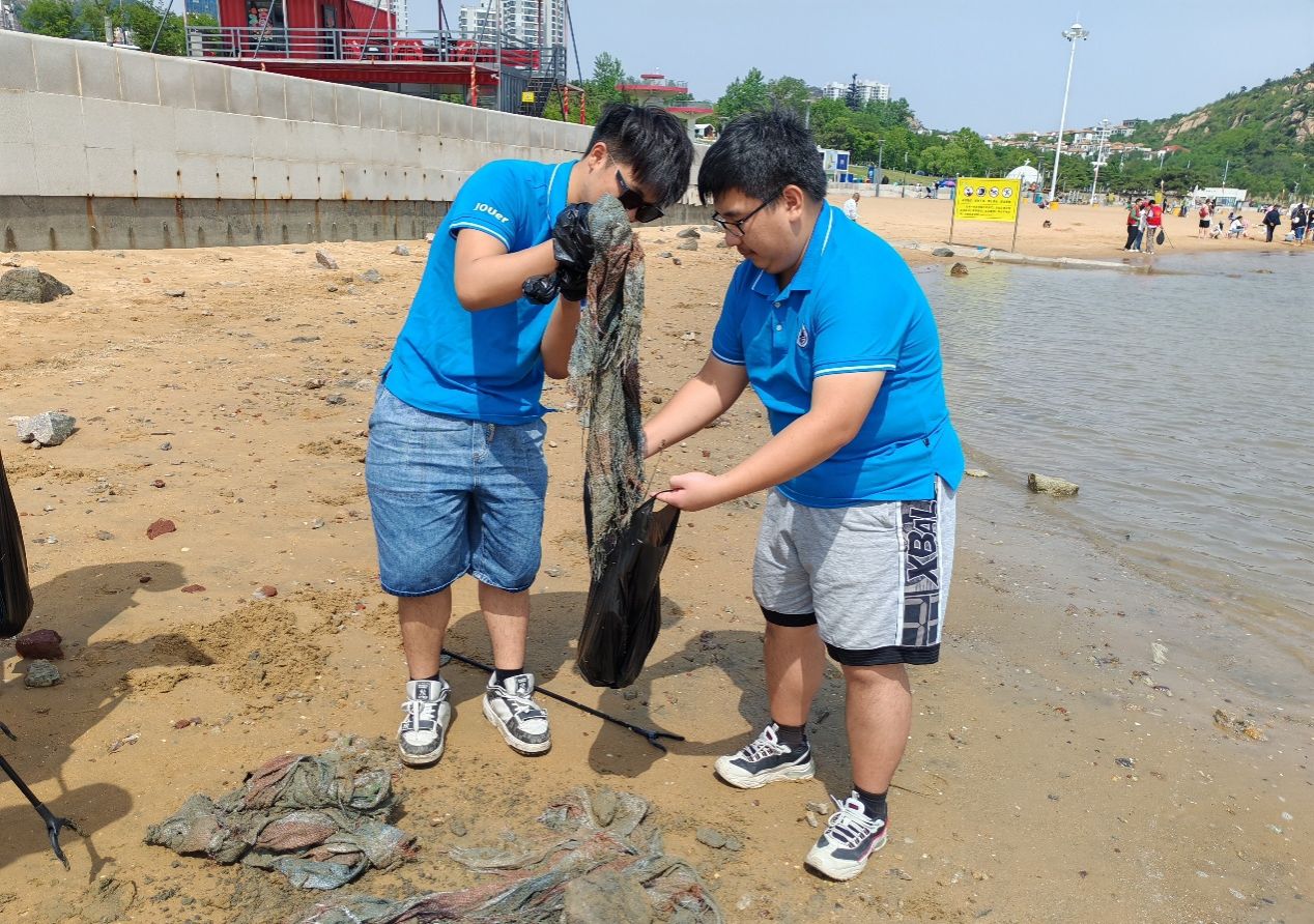 一次次弯腰,一次次捡拾,一次次分类装袋——志愿者们的动作娴熟而专注。他们俯身于潮汐之间,以双手清理垃圾,用行动传递理念,在海浪的节拍中谱写着属于青春的环保篇章。