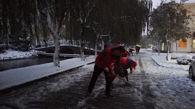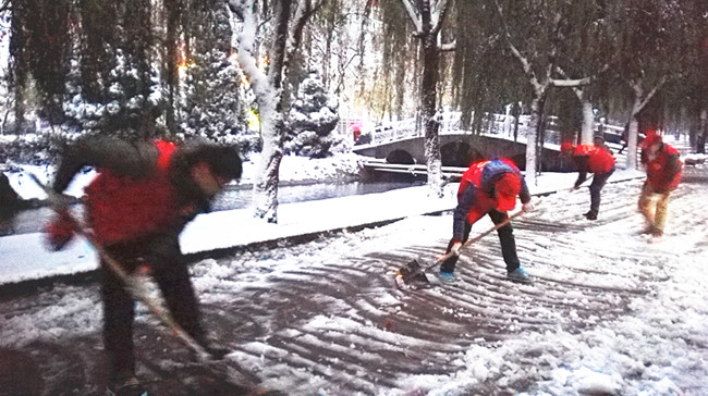 整个除雪活动从下午4点持续到6点,志愿者们顶着风雪、不畏严寒,清扫道路积雪,经过近2个小时的奋战,生活区一食堂、三食堂附近道路被清扫出来,刚刚下课前往食堂就餐的同学们行走在没有积雪的道路上,用微笑回报志愿者们辛勤的劳动。虽然雪还在下,志愿者清扫出来的道路在天黑后又铺上了一层积雪,但是志愿者们表示会带动更多的同学自愿清扫积雪,用行动诠释“奉献、友爱、互助、进步”的志愿服务精神,建设和谐、友爱的淮海园。