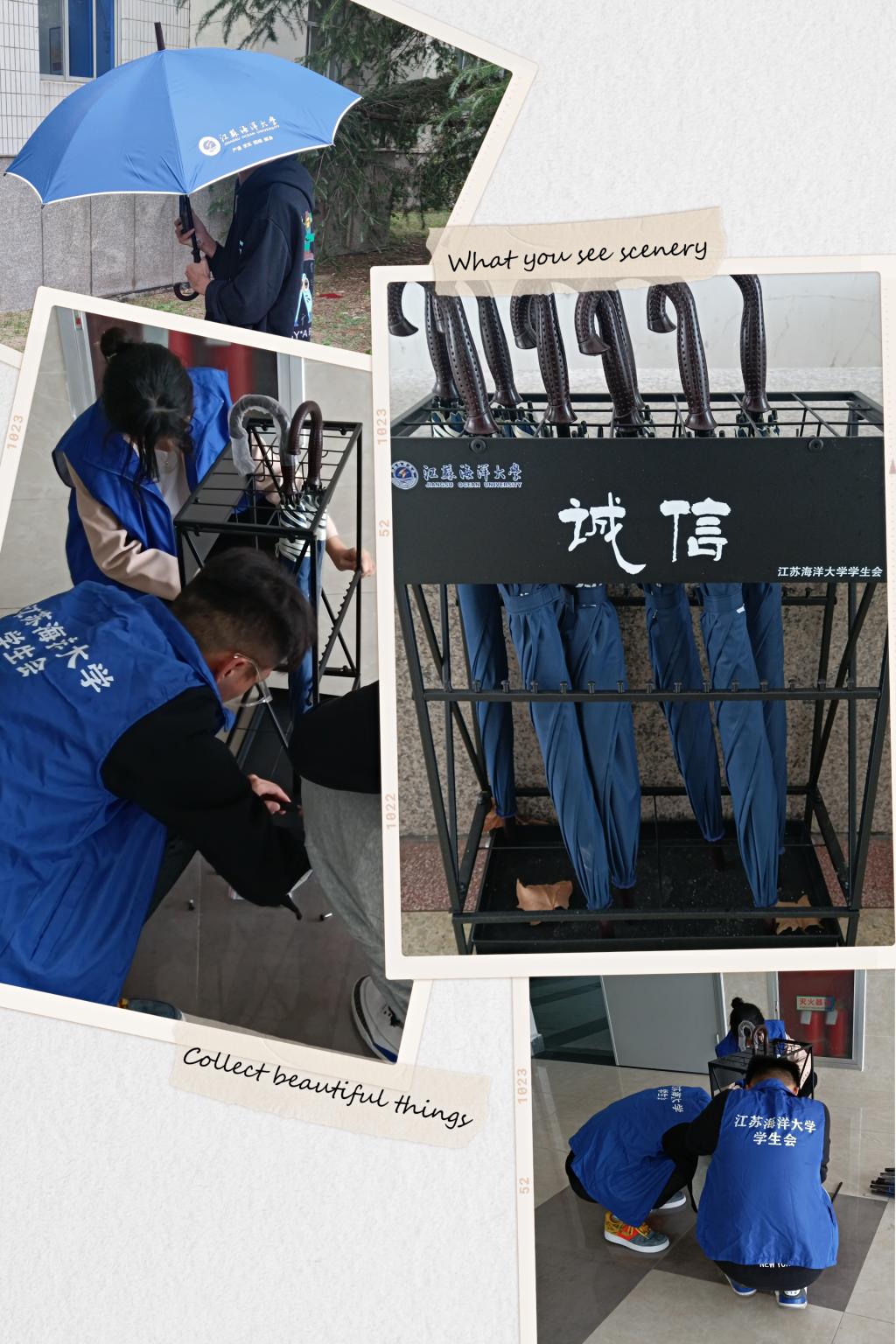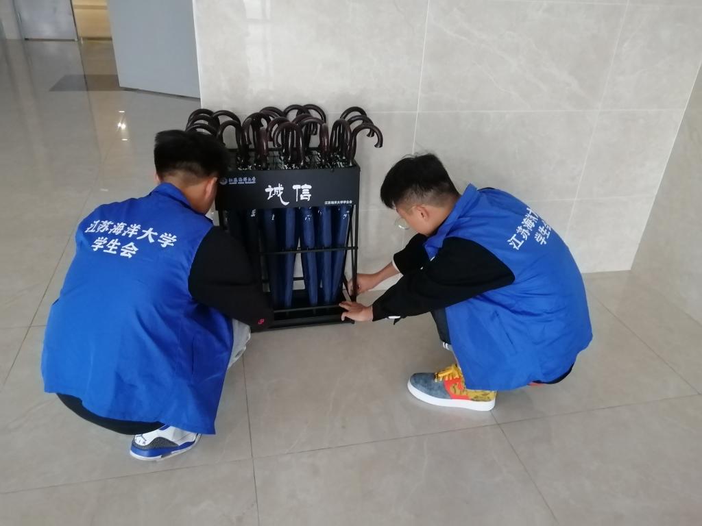 经过前期的策划、筹备与调试,10月初,我校“诚信雨伞”正式上线,在苍梧校区主楼、文通楼、文思楼、文华楼等教学区域设置6个服务站点、投放诚信雨伞200把,在秋雨来临前为同学们遮风挡雨。经过两周测试,所有诚信雨伞运行良好,同学们反响极佳,来自文法学院的秦同学反馈说:“晚自习离开教室的时候,才发现下去了雨,正在犹豫要不要打电话麻烦室友送伞的时候,看到了大厅里的诚信雨伞,感觉学生会的同学很用心。”
