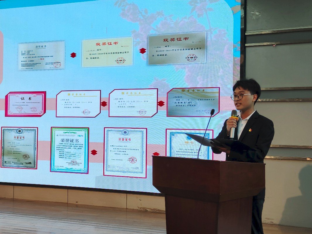 展示会上,候选人逐次登台展示了各自精彩的大学生活,分享了自己在专业学习、学生组织、科技创新、志愿服务等方面的经历和收获。他们之中,有心怀家乡、热衷于宣传乡村振兴新面貌的学霸;有乐于助人、热心公益的志愿者;有甘于奉献、担当感恩的学生组织骨干;还有3年获奖60多次的“创新达人”。高学分绩点、预备党员、奖学金、获奖证书、疫情防控志愿者成为他们共同的名片。
