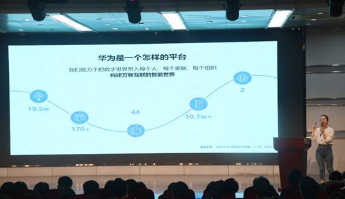 李童童以“大梦想 正当时”为主题进行演讲,她首先抛出问题“华为是一个怎样的我平台”,通过互动让观众猜测ppt上的数字的含义,向观众展示华为目前的成就。然后为大家呈现华为近30年来的销售收入折线统计图,告诉同学们30年厚积薄发,脚踏实地长跑的道理。最后向观众展示了几例华为发展的探索方法以及碰壁后的处理方法,让同学们学习到解决问题的思路与方法。