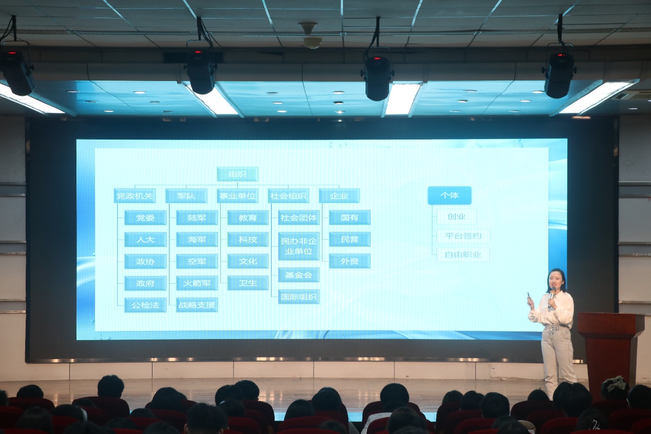 耿盈晴老师向同学们讲解了就业形势、职业生涯规划与职业选择等内容。她从个体、创业、平台签约、自由职业的顺序分别介绍职业的选择与就业规划,通过表格、树状图等为同学们详细地说明了就业的类别与职业组织的类别,例如党政机关方面分为党委、人大、政协、政府、公检法等。她又向同学们展示了一些毕业生求职受挫的实例,给予同学们合理的建议并鼓励大家理性求职,秉持积极向上的态度。