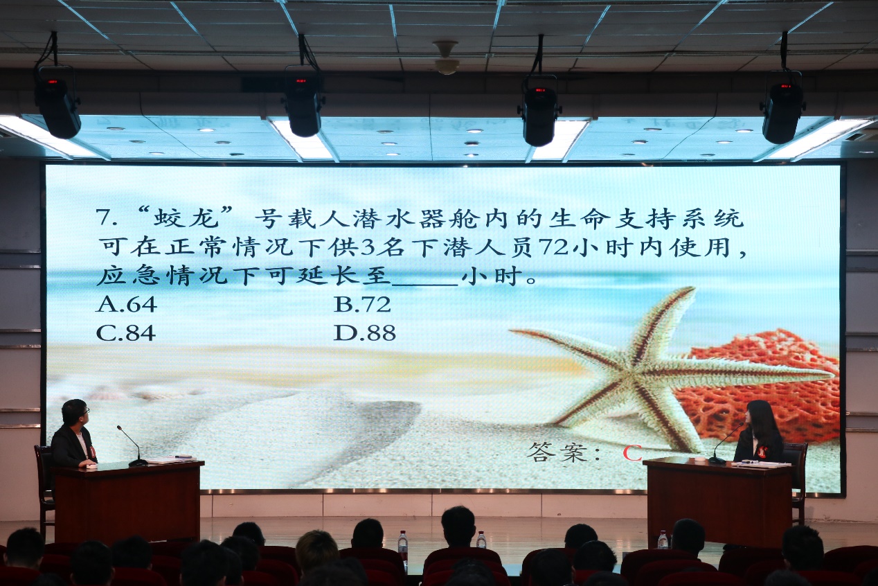 前期经过初赛、复赛的激烈角逐,共有十名选手脱颖而出参与本次决赛的同台竞技。决赛分为“争分夺秒”抢答赛、“乘风破浪”答题赛和“给定主题演说”三个环节。在“争分夺秒”抢答环节中,各组选手胸有成竹地上台,争先恐后抢答,展现出了卓越的竞技表现。在“乘风破浪”赛中,选手沉稳自信地展示广博的海洋知识面和敏捷的反应能力,台下观众送来阵阵掌声。