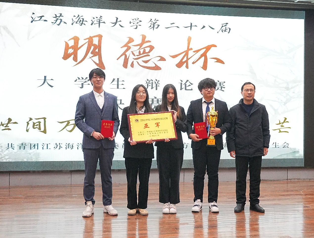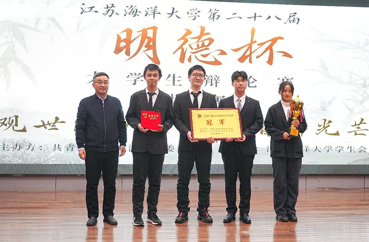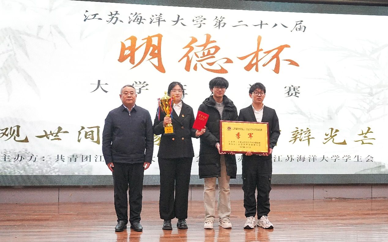 12月5日晚,江苏海洋大学第二十八届“明德杯”大学生辩论赛决赛在艺术楼报告厅隆重举办。党委学生工作部部长、学生工作处处长陈德翼,海洋科学与水产学院党委书记黄金虎,马克思主义学院党总支书记韩振响,校团委副书记王衍、黄媛出席比赛并担任评委。
