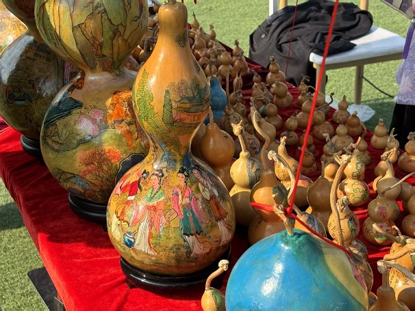 活动现场热闹非凡,多项国家级、省级非遗项目惊艳亮相。海州剪纸传承人现场演示“以纸为布、以剪代笔”的绝技,《龙凤呈祥》《连岛渔歌》等作品细腻灵动;葫芦绘画大师指尖翻飞间,栩栩如生的《西游记》人物跃然眼前;面塑王师傅的作品惟妙惟肖,他不仅热心帮助工作人员一起布置现场,还为同学们制作童年回忆--棉花糖;糖画艺人以勺为笔、糖稀为墨,转瞬勾勒出生肖糖画。
