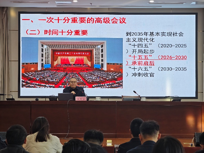 吴明忠围绕学习贯彻习近平总书记在党的二十届四中全会上的重要讲话精神和全会《建议》,从全会的重要意义和《建议》的起草过程,“十五五”时期承前启后的重要作用等方面,对全会精神做了深入阐释。报告会上,吴明忠通过“十四五”规划与“十五五”规划对比,动态发展理解“十五五”时期经济社会发展的战略任务,要求深刻领悟“两个确立”的决定性意义,增强“四个意识”、坚定“四个自信”、做到“两个维护”,切实把党描绘的美好蓝图转变为青春奋斗的光辉现实。我校文法学院何悦从青年学生角,结合本次全会精神同讲师开展问答交流。