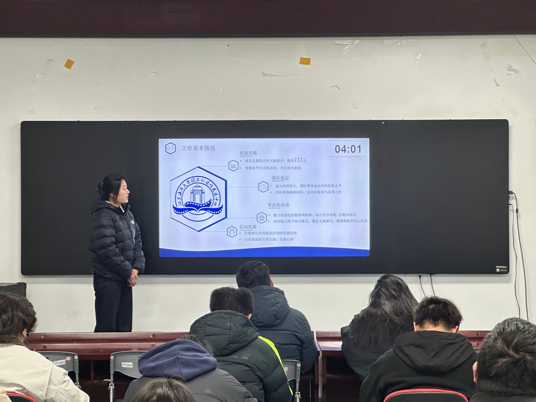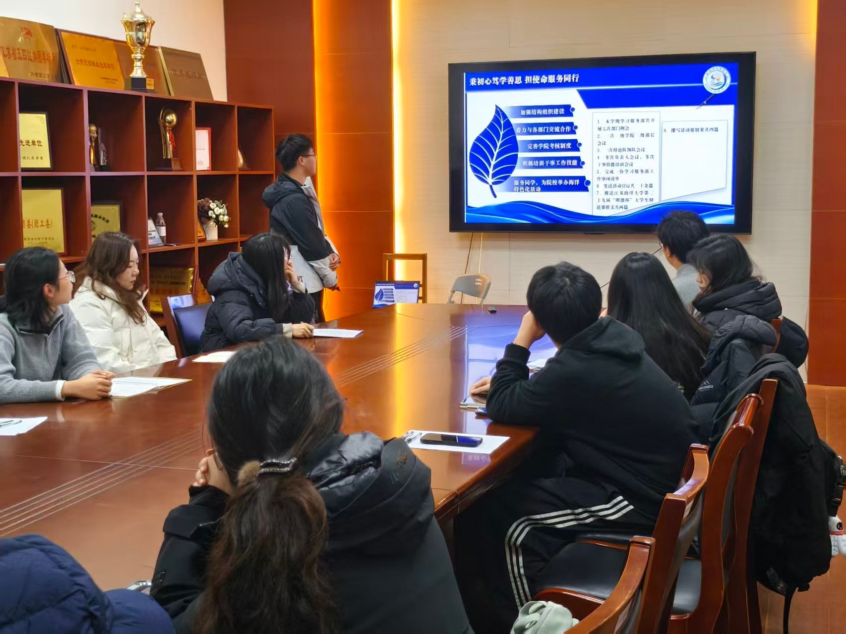 汇报活动分设团委会议室与团培会议室两大分会场。在团委会议室,学生会、研究生会、大学生成长成才服务中心及青年志愿者协会的负责人依次登台,他们以翔实的数据、生动的案例,结合各自岗位职责与工作实际,全面回顾了上学期在促进校园文化建设、服务学生成长成才、志愿服务等方面所取得的显著成效。从组织策划大型活动到细致入微的学生服务,每一项工作都凝聚着学生干部的智慧与汗水,展现了他们勇于担当、积极作为的精神风貌。与此同时,在团培会议室,学生社团管理中心、新媒体发展中心、大学生科技协会及大学生艺术团的负责人则围绕思想引领、组织建设、品牌活动等方面汇报了工作实绩,从社团文化的繁荣发展到新媒体平台的创新传播,从科技竞赛的激烈角逐到艺术舞台的精彩绽放,各组织均以其独特的工作特色与亮点,为校园文化生态的多元化发展贡献了重要力量。