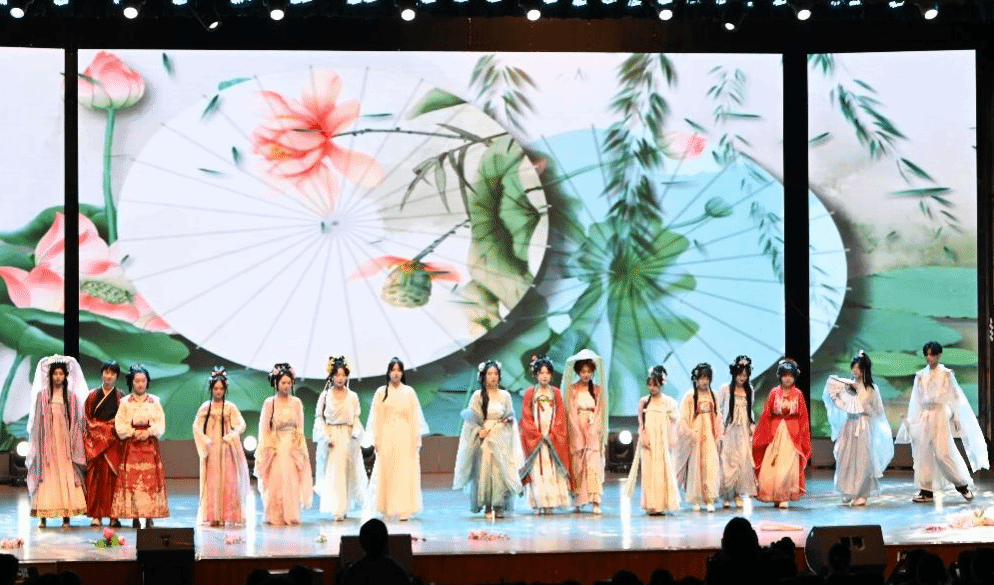 如果说上半场是视听的享受,下半场则是文化的狂欢。艺馨艺术团的相声幽默灵动,台下笑声与掌声此起彼伏;魔术变脸社的川剧变脸将气氛推向高潮--脸谱在红黑光影间瞬息万换,宛若千面人生轮转,令观众叹服于非遗技艺的神奇魅力;大学生艺术团的舞蹈《咏春》刚柔并济,将传统武术招式与现代舞蹈律动巧妙融合,演绎出动静相宜的东方美学。晚会在国风社的汉服走秀《花神赋》中进入尾声。模特们身着各式汉服,步履轻盈、顾盼生姿,宽袍大袖间尽显华夏礼仪之邦的端庄气度。这一刻,历史不再是泛黄的书页,而是一幅流动在舞台上的东方画卷。