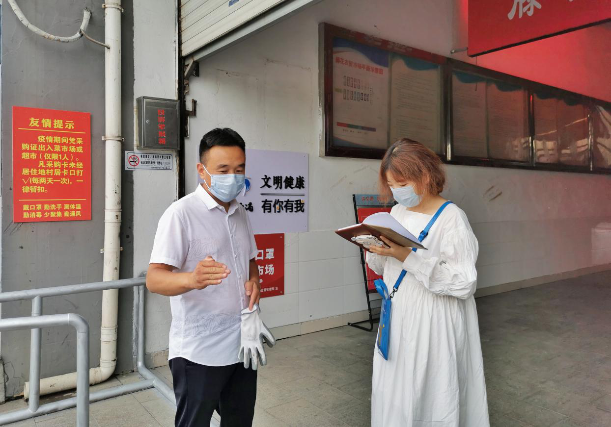 7月19日,江苏海洋大学商学院王璇同学前往连云港市开发区藤花农贸市场开展疫情防控宣传。农贸市场人流密集,更需严加防范,王璇对当地市场负责人孙正洋进行了采访,负责人表示针对疫情防控部署全面到位,我校志愿者向各个市场摊主、来往路人分发疫情防范宣传手册,普及疫情防控知识,增强防控意识,早日打赢疫情防控阻击战。