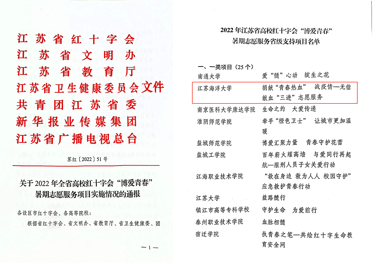 多年来,江苏海洋大学一直高度关注和积极参与人道事业,通过科普讲座、无偿献血和急救培训等形式开展生命教育,引导大学生正确认识生命的过程和意义,树立健康、科学、文明的生命理念。并以实际行动助力无偿献血事业发展,为保障疫情防控期间临床用血贡献江海大力量。
