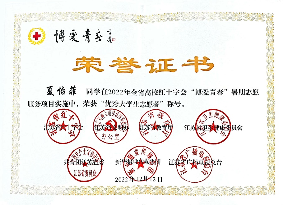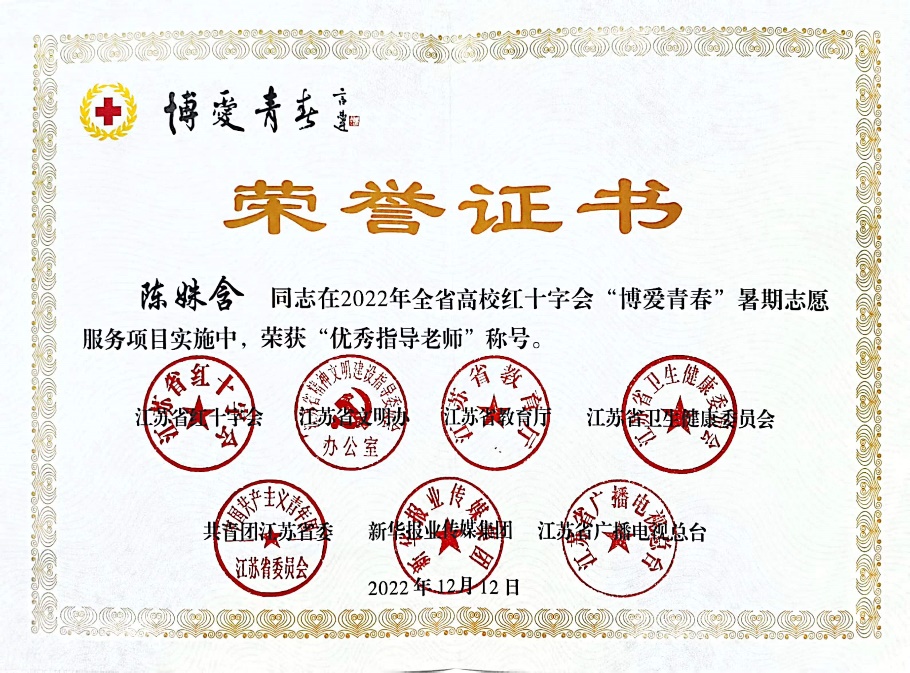 近日,由江苏省红十字会、省文明办、省教育厅、省卫生健康委员会、团省委、新华报业传媒集团、省广电总台联合开展的2022年江苏省高校红十字会“博爱青春”暑期志愿服务项目总结展示活动在南京举行。全省高校共申报项目114个,其中60个项目成功立项,通过网络票选、汇报展示,最终评选出一类项目25个,二类项目35个,其中“十佳项目”10个,优秀项目提名奖10个。我校应用技术学院开展的“捐献青春热血”战疫情——无偿献血“三进”志愿服务项目被评为一类项目并荣获省优秀项目提名奖。项目指导老师陈姝含被评为“优秀指导老师”,夏怡菲、张子为两位同学被评为“优秀大学生志愿者”。