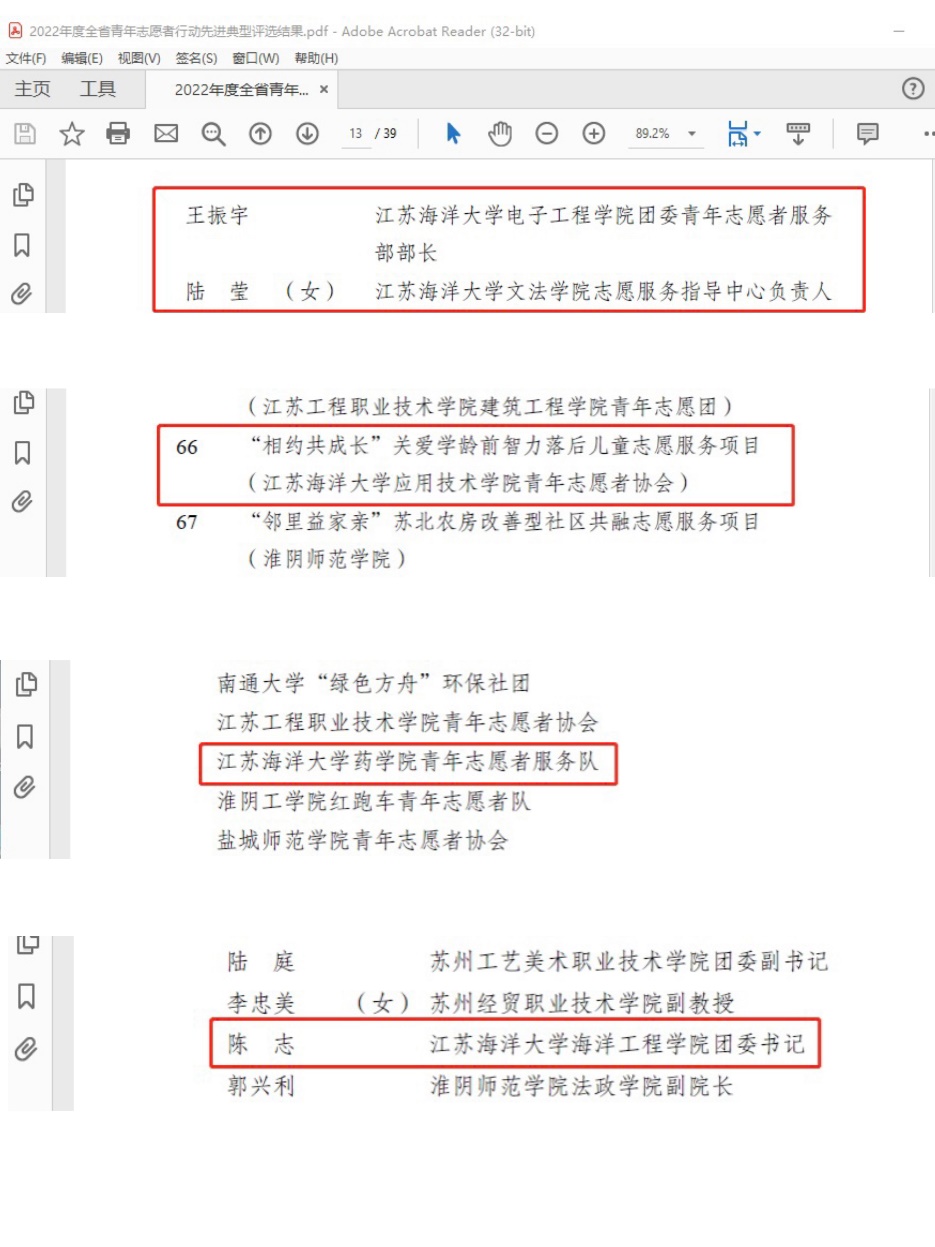 4月6日,由江苏省志愿者协会开展的2022年度全省青年志愿者行动先进典型评选活动公布获奖名单,我校电子工程学院王振宇、文法学院陆莹两位同学荣获江苏省优秀青年志愿者,应用技术学院青年志愿者协会的“ ‘相约共成长’关爱学龄前智力落后儿童志愿服务项目”荣获江苏省优秀青年志愿服务项目,药学院青年志愿者服务队荣获度江苏省青年志愿服务行动组织奖,海洋工程学院团委书记陈志荣获江苏省青年志愿服务事业贡献奖。
