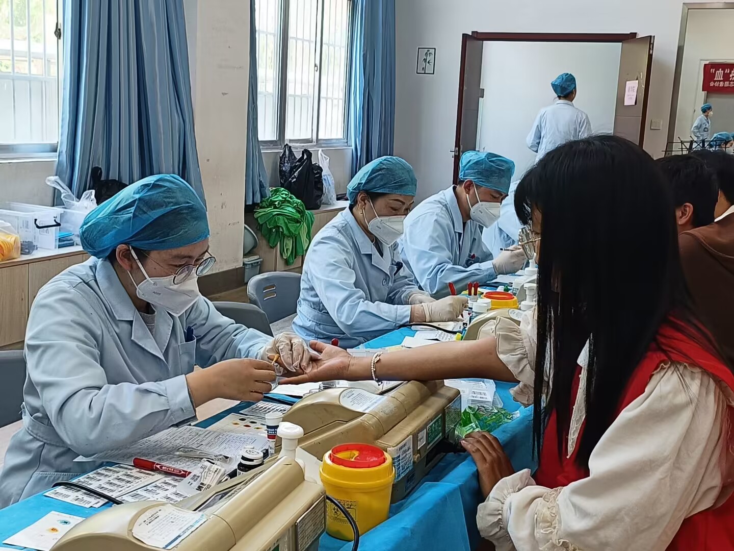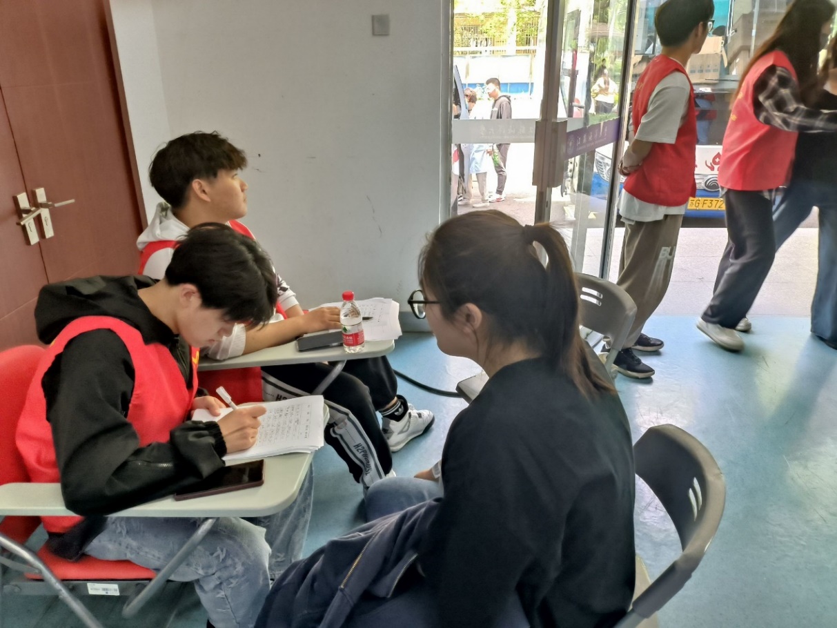 两位身着红马甲的志愿者站立在门口,耐心地向同学们介绍献血的流程;帮忙测量血压的志愿者在医护人员的指导下逐渐熟悉仪器的使用,从手法生疏很快变得得心应手;另有志愿者贴心地为献血者准备糖水。