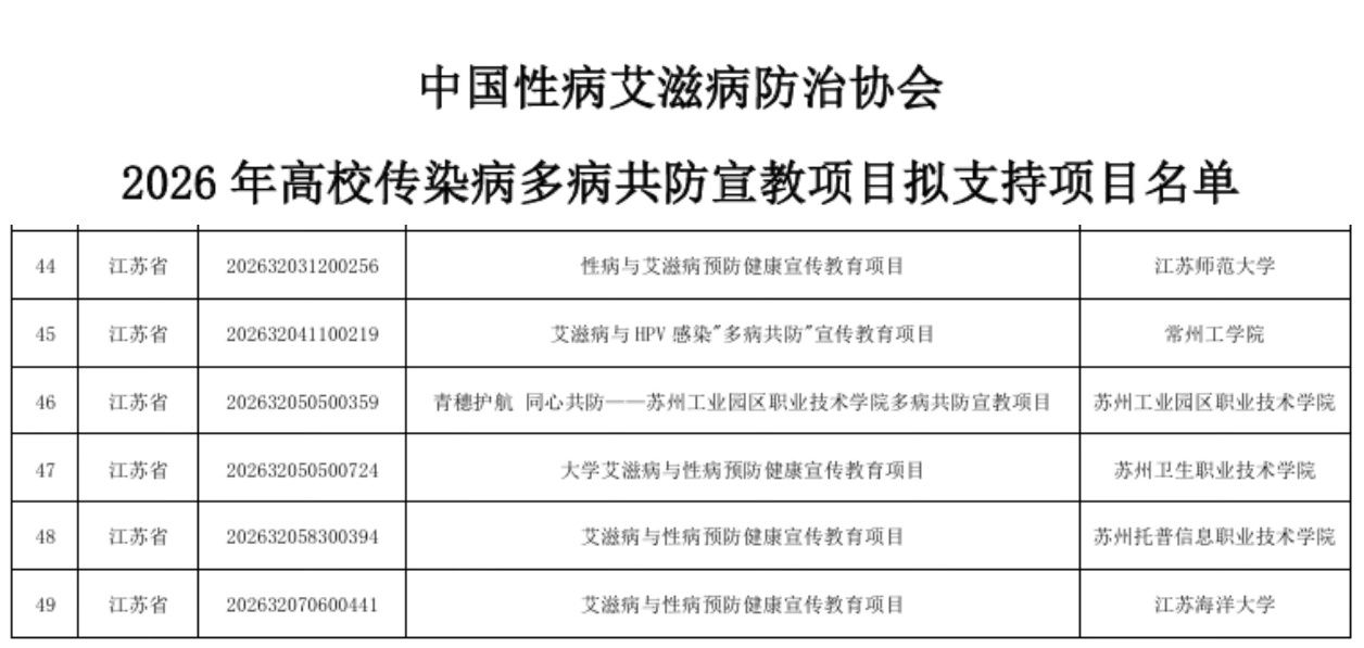 近日,中国性病艾滋病防治协会(简称“中艾协”)正式公布2026年高校传染病多病共防宣教项目支持名单。由我校团委申报的《艾滋病与性病预防健康宣传教育项目》成功入选,这标志着我校在健康学校建设和传染病防控宣教领域迈上新台阶。此前,我校防艾项目已成功获得2024年、2026年江苏省社会组织参与艾滋病防治项目立项与资金支持,并被江苏省预防医学会评为“艾滋病防治优秀团体”,在江苏省高校青年志愿服务项目大赛中荣获二等奖。