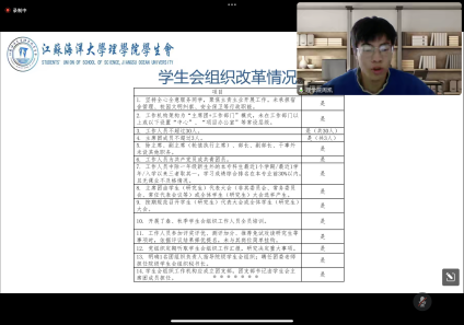 2023年1月5日下午,江苏海洋大学学生会2022年度优秀分会评比通过腾讯会议线上开展。学生工作部、团委负责同志及教师担任评委,各学院学生会指导老师和成员在线观看。